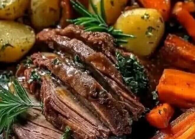 This pot roast is rich, tender, and comforting. The beef chuck slowly transforms into melt-in-your-mouth slices, infused with garlic, onion, and herbs. Carrots bring a subtle sweetness, while potatoes soak up the savory broth, making every bite hearty and fulfilling. The aroma of herbs and roasted meat fills the home, creating the perfect atmosphere for family dining.