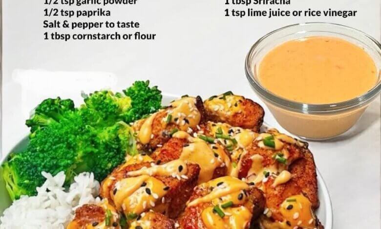 - While the salmon is cooking, prepare the Bang Bang Sauce. In a small bowl, whisk together mayonnaise, sweet chili sauce, Sriracha, and lime juice (or rice vinegar). Adjust the spice level by adding more Sriracha for heat or additional sweet chili sauce for a milder flavor.