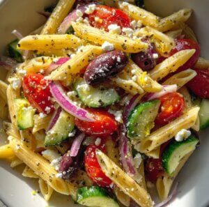 The dish is inspired by the classic Greek salad (Horiatiki), which traditionally features fresh vegetables, olives, and feta cheese dressed simply with olive oil, oregano, and lemon. Over time, pasta was introduced to create a more filling meal while retaining the authentic Greek flavors. Greek cuisine celebrates freshness, balance, and simplicity, and this pasta salad embodies those principles, making it a popular dish across cultures for potlucks, picnics, and family meals.