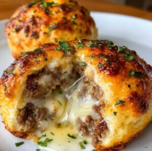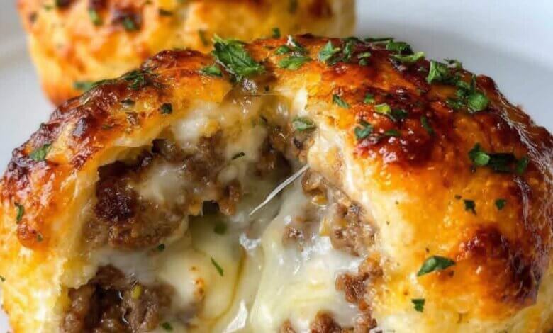 Golden, fluffy biscuit dough encases a juicy pocket of seasoned beef and molten cheese. The buttery garlic-Parmesan coating adds crunch, aroma, and richness. Each bite bursts with classic cheeseburger comfort but in a compact, snackable form.