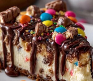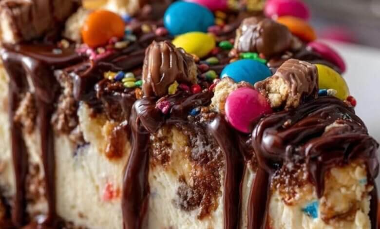 Pair this cheesecake with a cup of espresso or a glass of cold milk for balance. For a lighter version, use low-fat cream cheese and reduce candy portions slightly — the flavor will remain indulgent yet balanced.