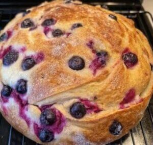 The finished loaf is visually stunning — golden brown crust with hints of blueberries peeking through, a soft marbled crumb, and a luscious cream cheese swirl. The taste balances tangy sourdough, sweet fruitiness, and rich creaminess, making each bite deeply satisfying. It’s moist, fragrant, and slightly chewy with a tender interior.